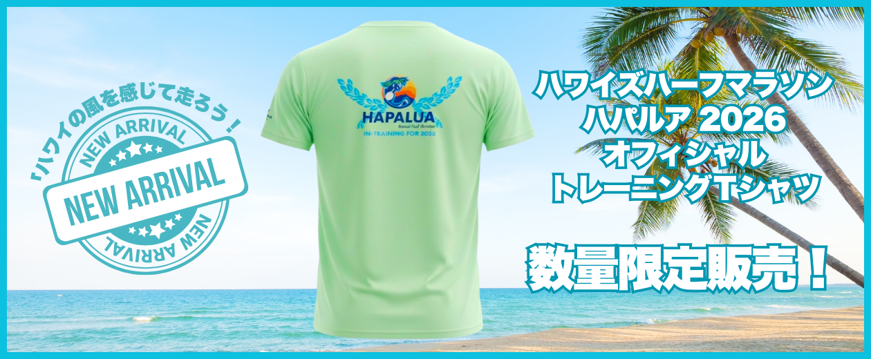 - 胸元:ホノルルの絶景を背景に描かれた、ランナーの躍動感あふれるシルエット。「FEEL ALOHA」のロゴが爽やかなアクセントに。