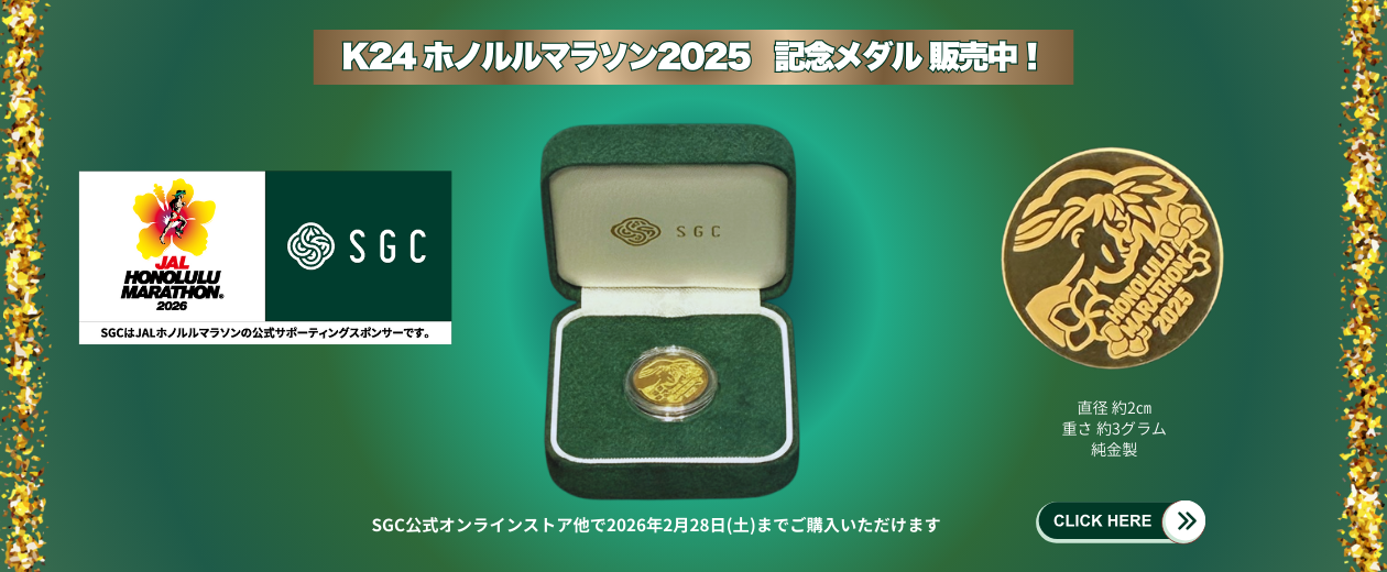 オフィシャルメダルスポンサー 株式会社SGC 純金のホノルルマラソン記念メダルEC販売開始! 販売期間は2025年2月28日(金)まで ホノルルマラソン2024のオフィシャル メダルスポンサー...