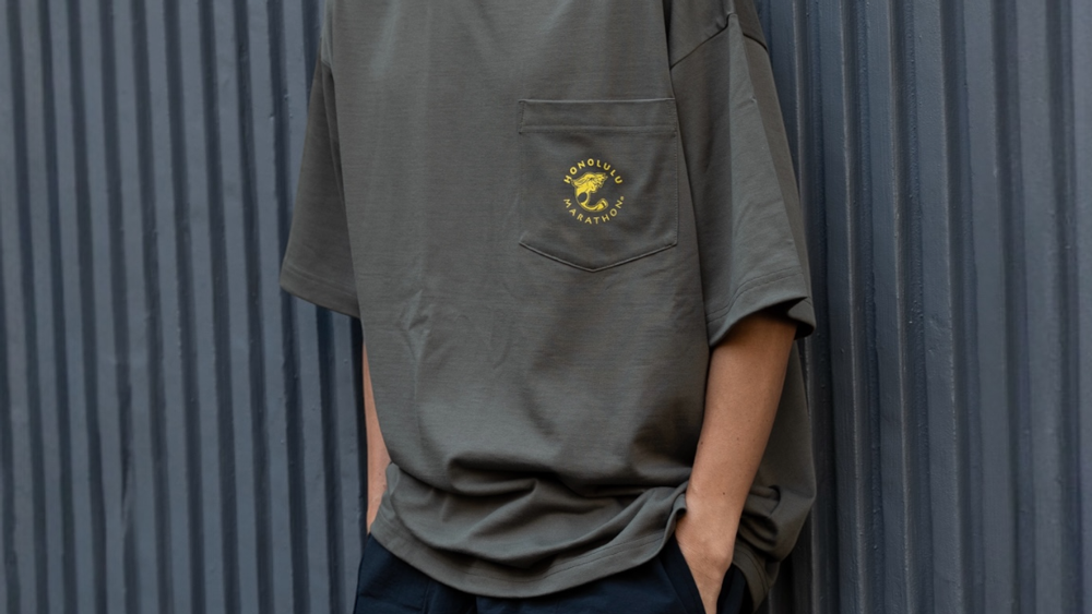 - 胸元:ホノルルの絶景を背景に描かれた、ランナーの躍動感あふれるシルエット。「FEEL ALOHA」のロゴが爽やかなアクセントに。